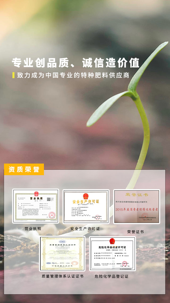 經(jīng)過二十余年的探索和實踐,依托自身技術(shù)和出口背景,按照國際市場規(guī)范培養(yǎng)了大批高素質(zhì)的專業(yè)化技術(shù)化團(tuán)隊,掌握了水溶性肥料的核心技術(shù),擁有完善的研發(fā)中心、質(zhì)檢中心,目前已獲得多個國家專利技術(shù)。公司一直把“做中國專業(yè)的特種肥料供應(yīng)商”作為自身的發(fā)展使命。推廣高端植物營養(yǎng)與先進(jìn)技術(shù),高效施肥方式的綜合配套方案,減輕中國種植業(yè)勞動強(qiáng)度,讓種植業(yè)效率更高、效果更強(qiáng)、效益更好!努力成為革新中國種植業(yè)生產(chǎn)方式的偉大公司!